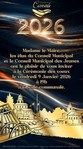 Mme Le Maire, le Conseil Municipal et le Conseil Municipal des Jeunes vous invitent à la cérémonie des vœux qui aura lieu le vendredi 9 janvier à 19h à la salle communale